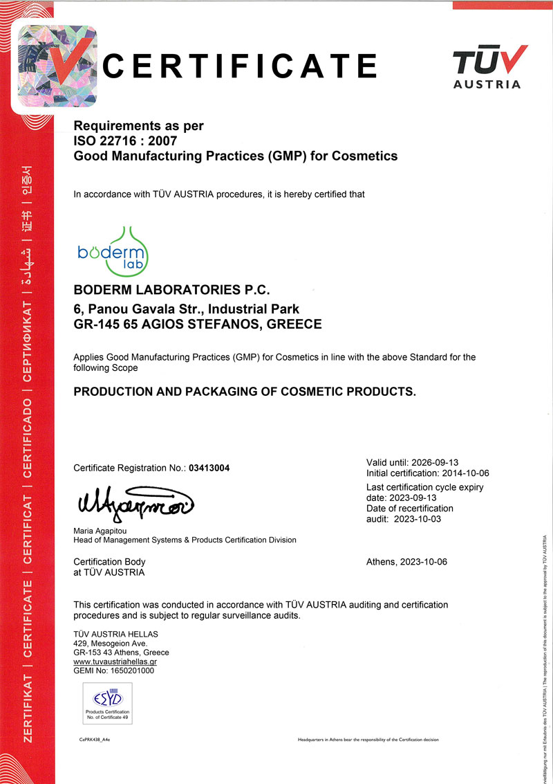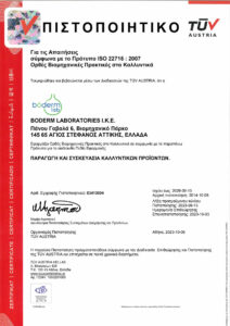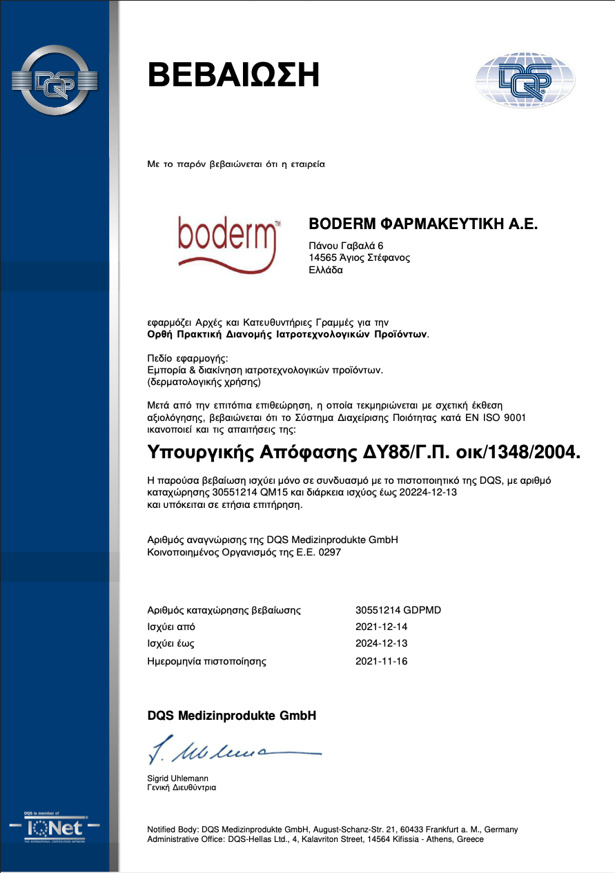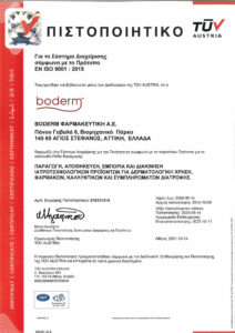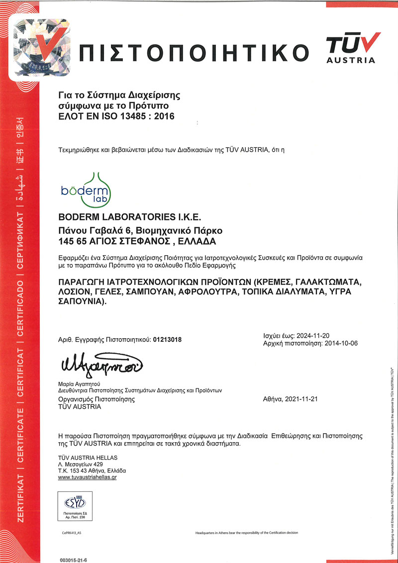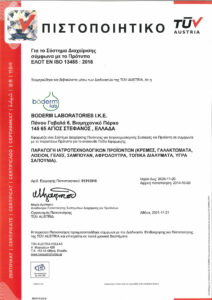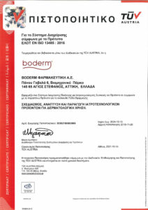Η εταιρία εφαρμόζει Σύστημα Διαχείρισης Ποιότητας σύμφωνα με τις απαιτήσεις των προτύπων ISO 13485:2016, ISO 9001:2015 και ISO 22716:2007.